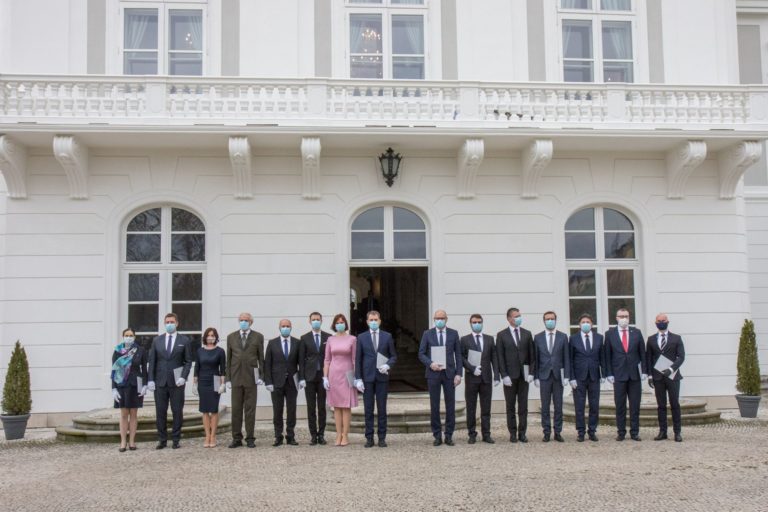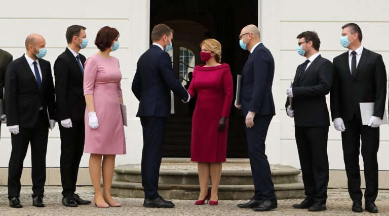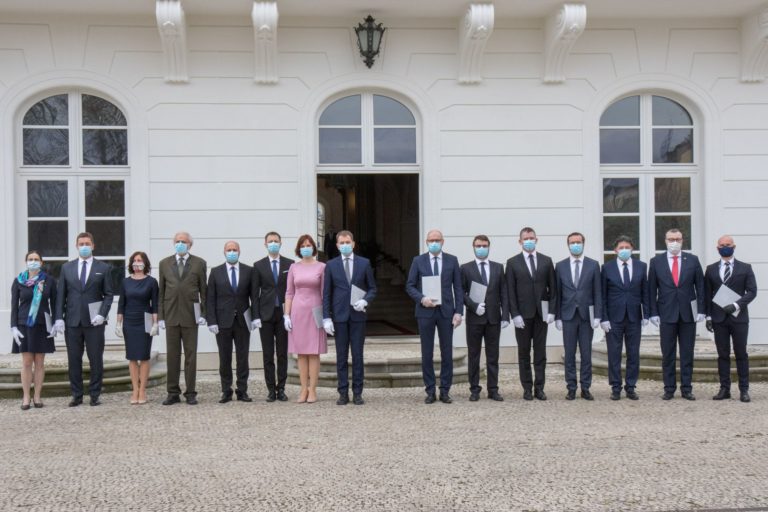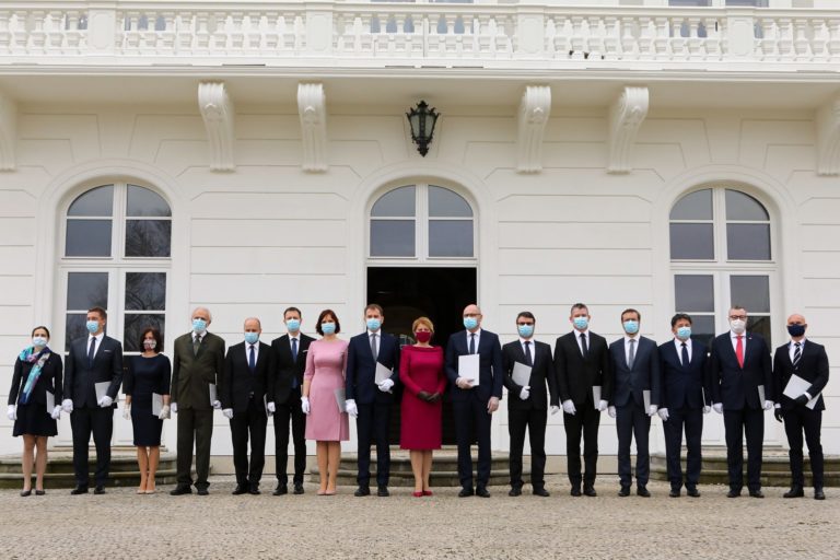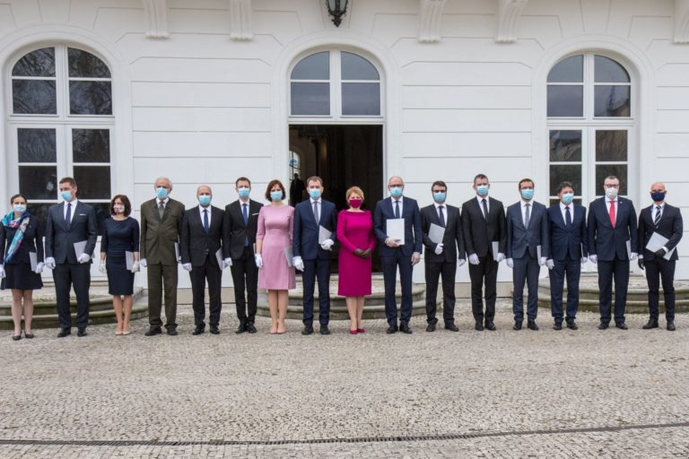 Členovia vlády SR počas fototermínu po ich vymenovaní prezidentkou SR v Prezidentskom paláci. Bratislava, 21. marec 2020. Foto: SITA/Ľudovít Vaniher