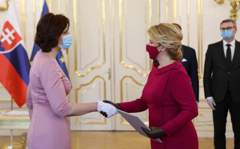 Prezidentka Zuzana Čaputová s vicepremiérkou Veronikou Remišovou počas slávnostného vymenovania novej vlády premiéra Igora Matoviča. 21. marec 2020 Foto: www.facebook.com