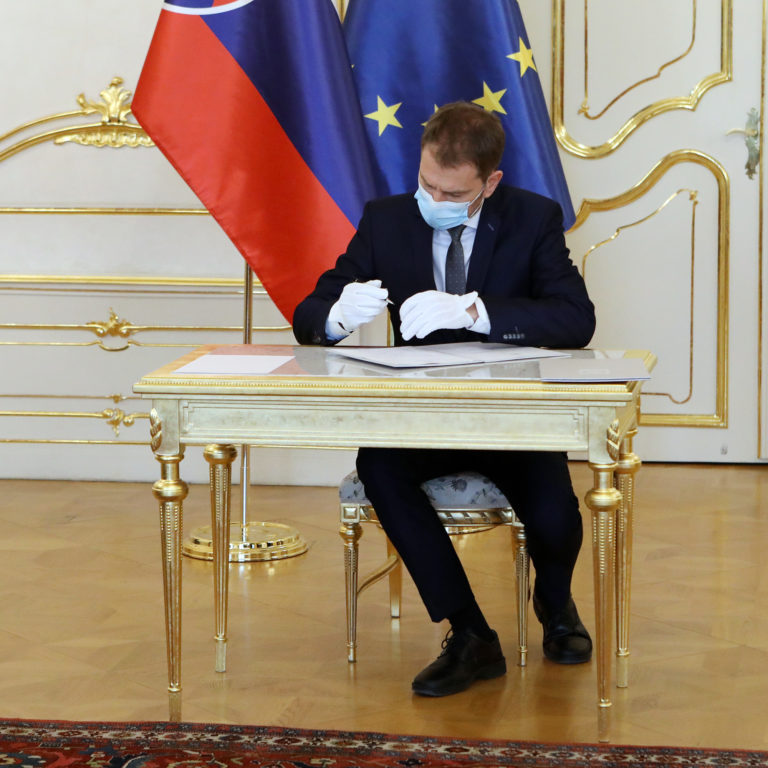 Nový premiér Igor Matovič pri slávnostnom vymenovaní jeho vlády prezidentkou Zuzanou Čaputovou. 21. marec 2020 Foto: www.facebook.com