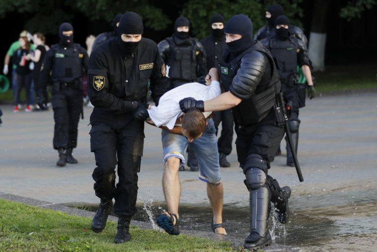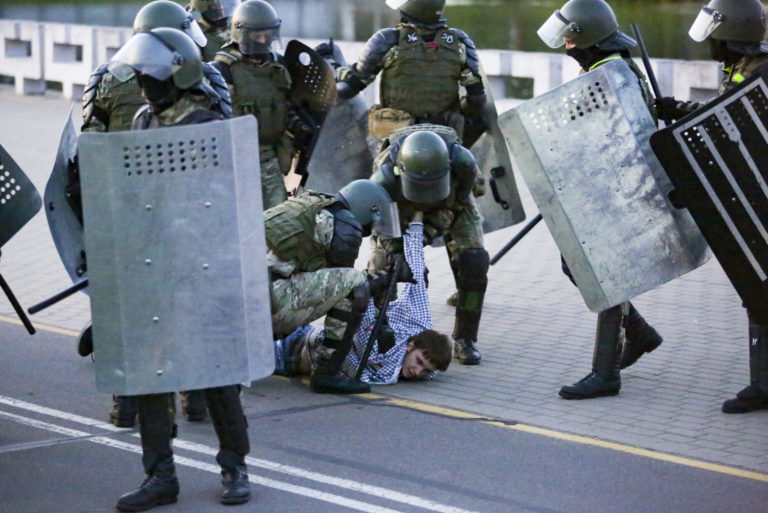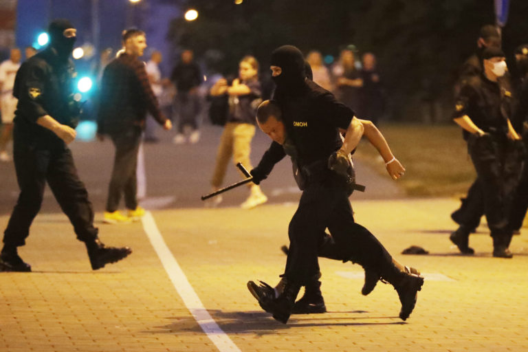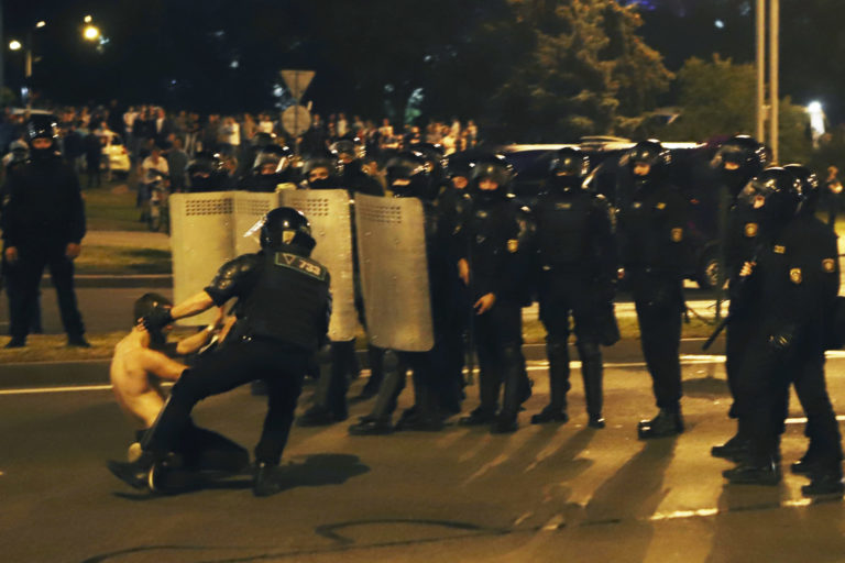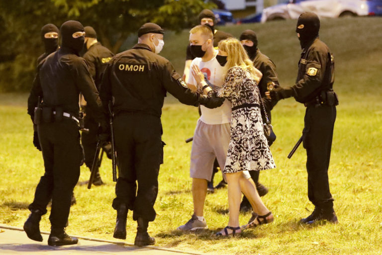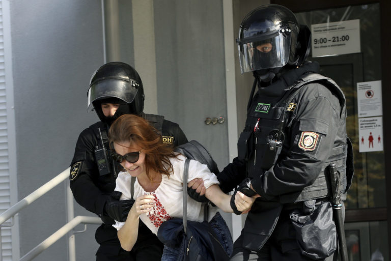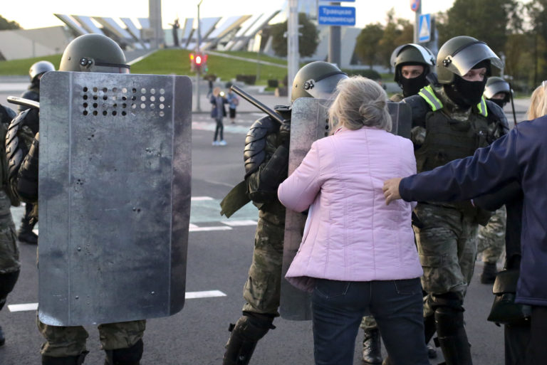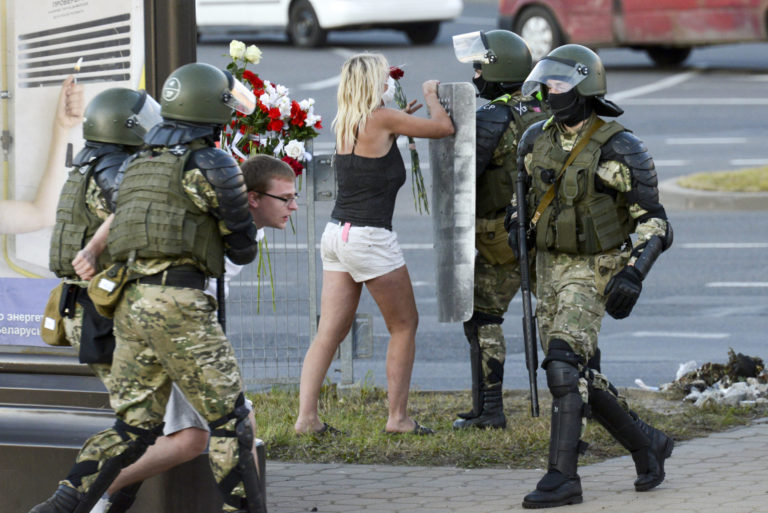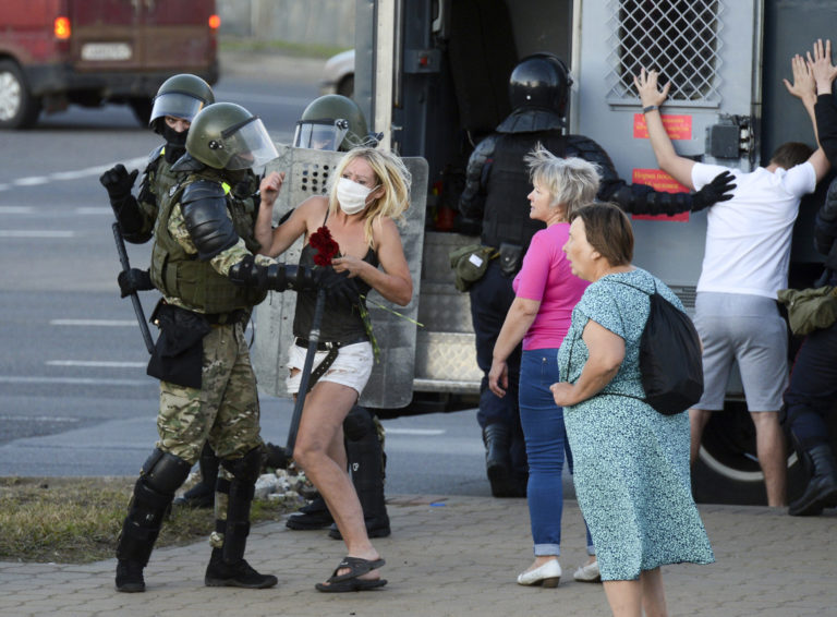 Bieloruská polícia zasiahla pri posledných protestoch tvrdo voči mužom i ženám. Neváhali použiť aj donucovacie prostriedky. Foto: SITA/AP