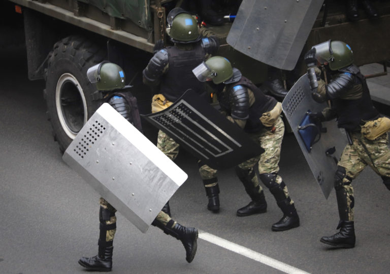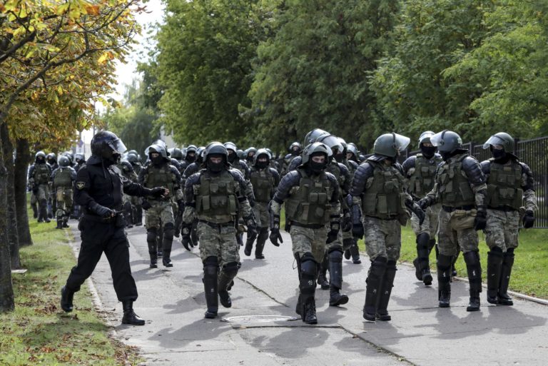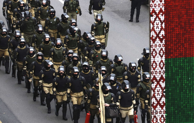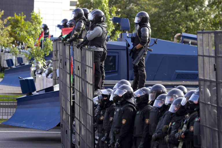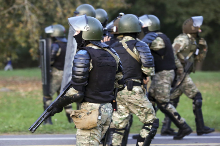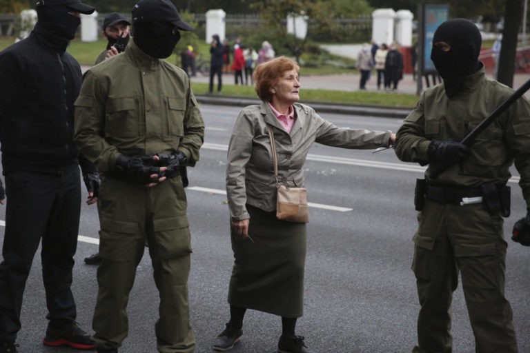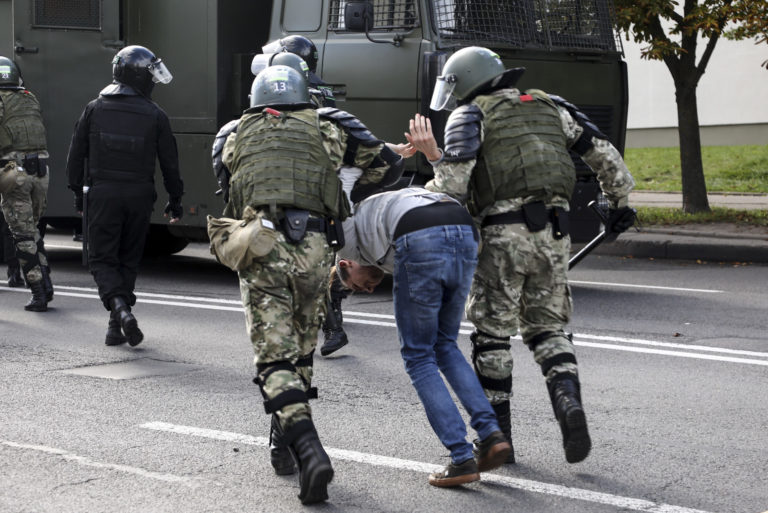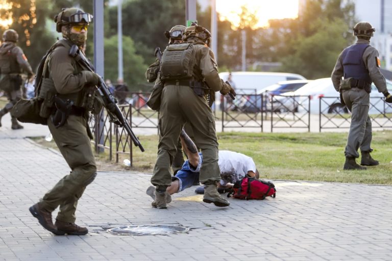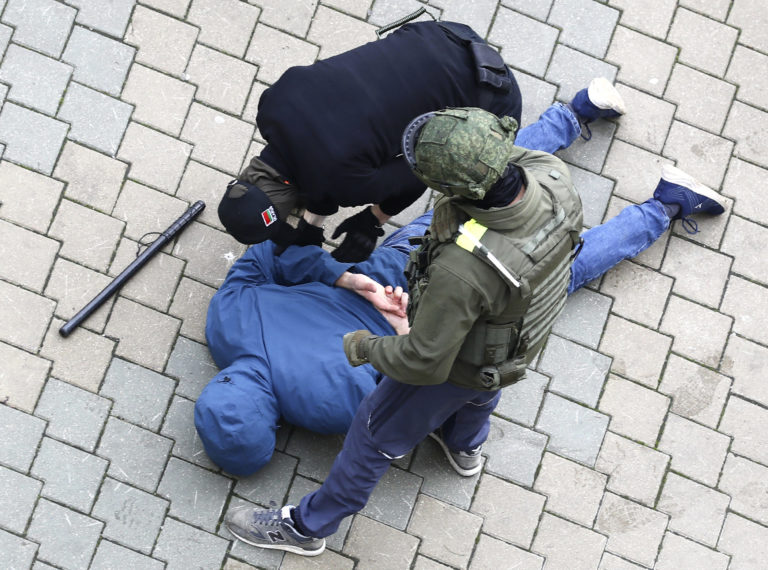 Bieloruská polícia zasiahla pri posledných protestoch tvrdo voči mužom i ženám. Neváhali použiť aj donucovacie prostriedky. Foto: SITA/AP