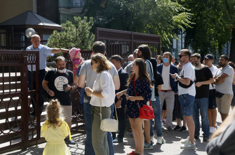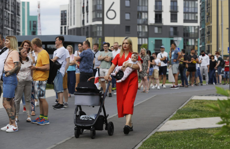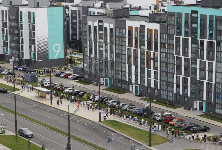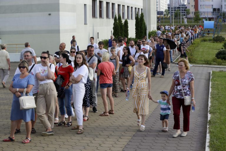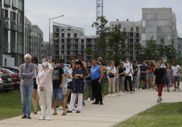 Zástup stoviek ľudí čakajúci pred bieloruskou ambasádou, aby mohli voliť. Foto: SITA/AP
