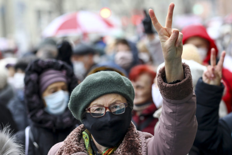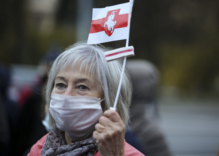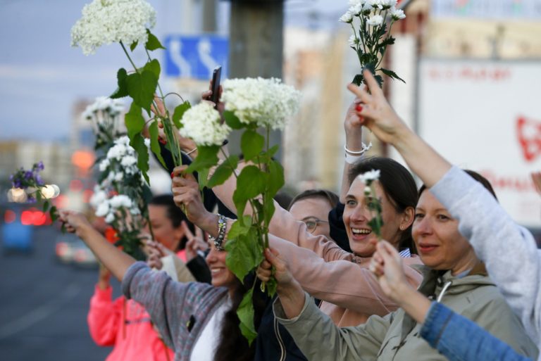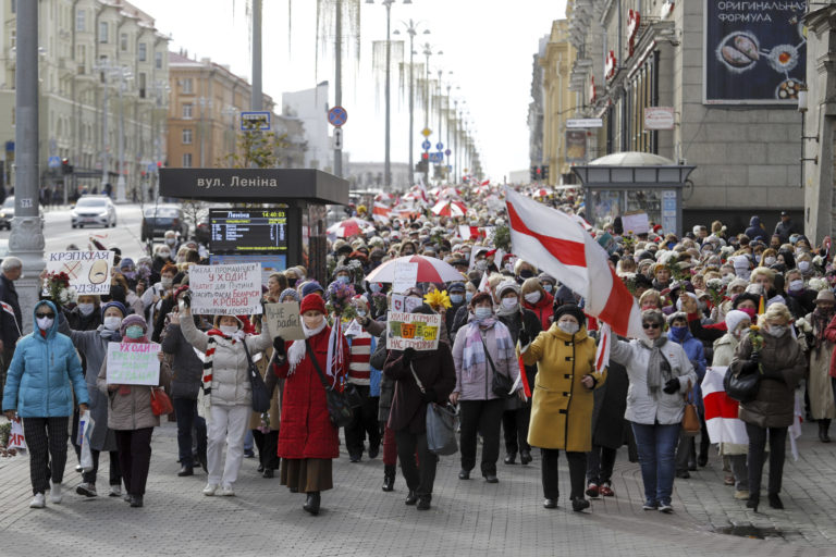 Staršie ženy držia kvety počas protestov proti prezidentovi Lukašenkovi. Minsk, 12. október 2020 Foto: SITA/AP