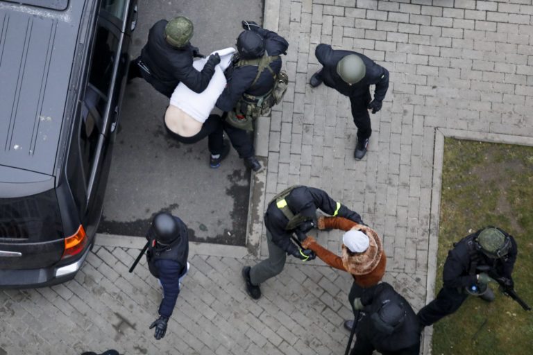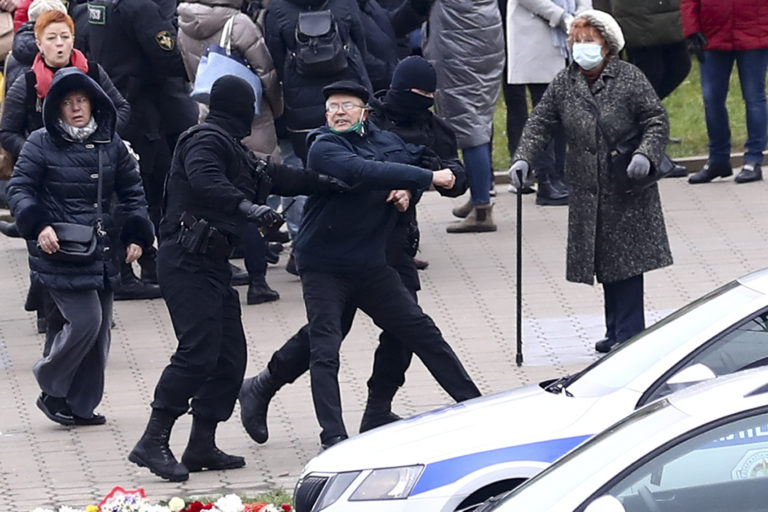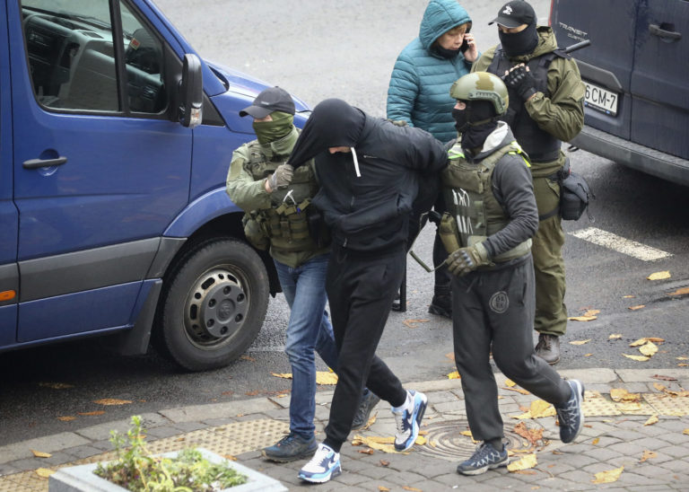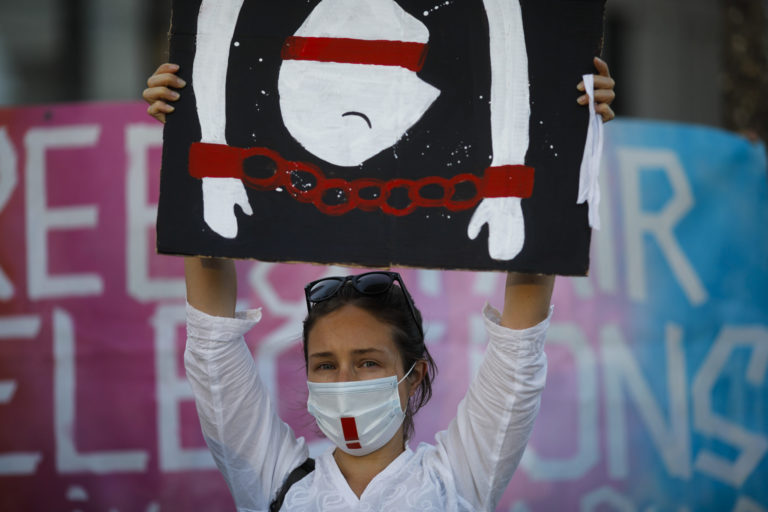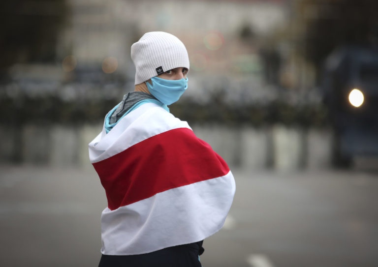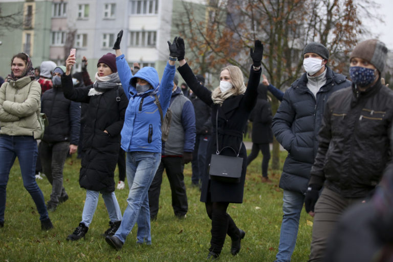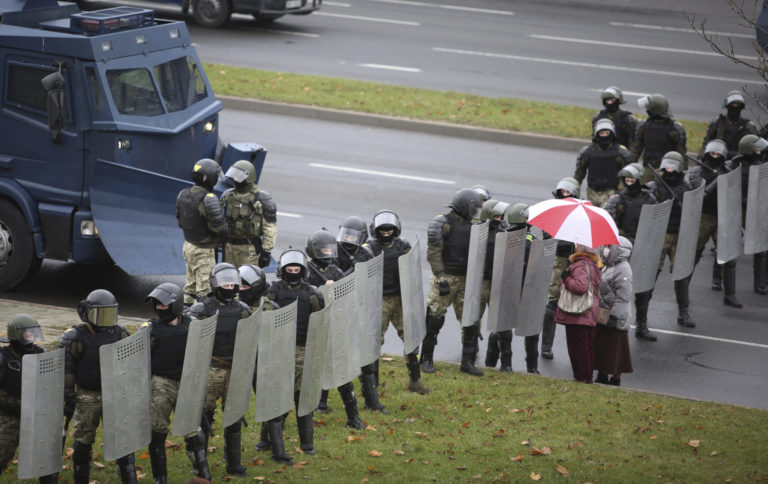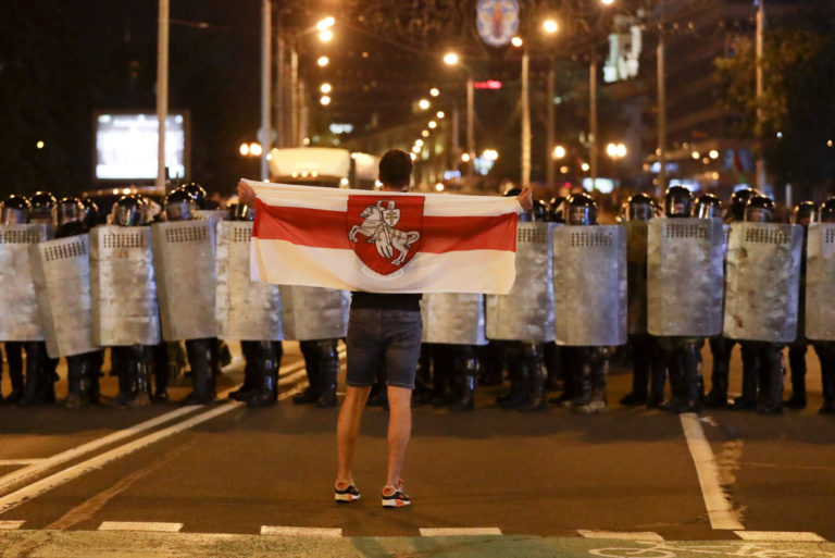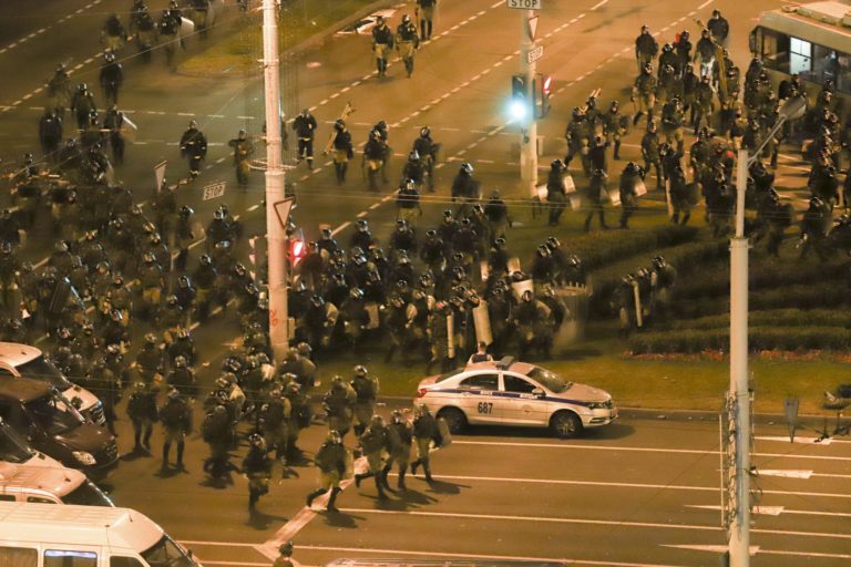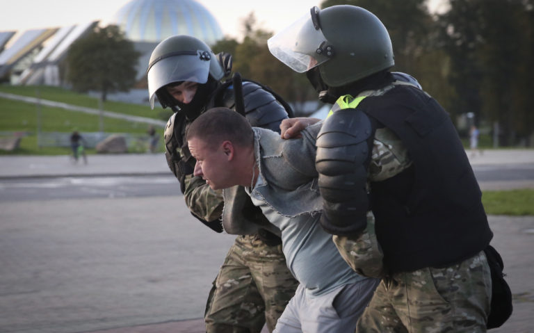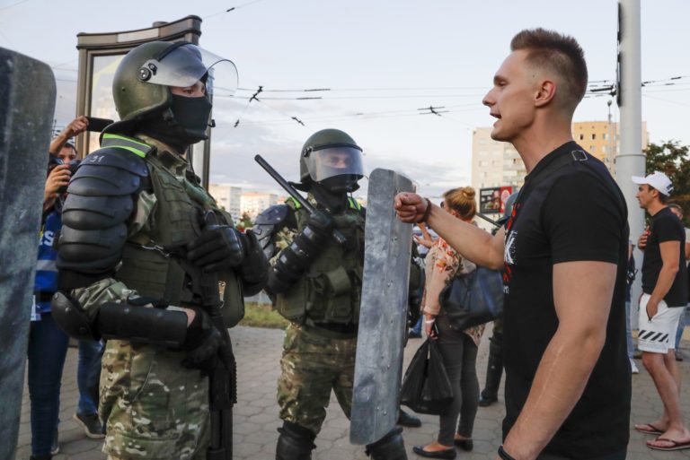 Protesty v Bielorusku neutíchajú ani po niekoľkých mesiacoch. Polícia zatýka čoraz viac ľudí. Je voči nim používané aj policajné násilie. Foto: SITA/AP