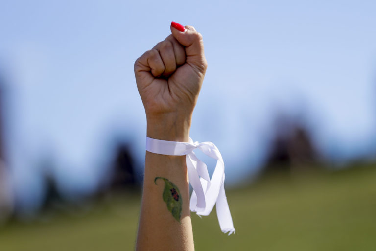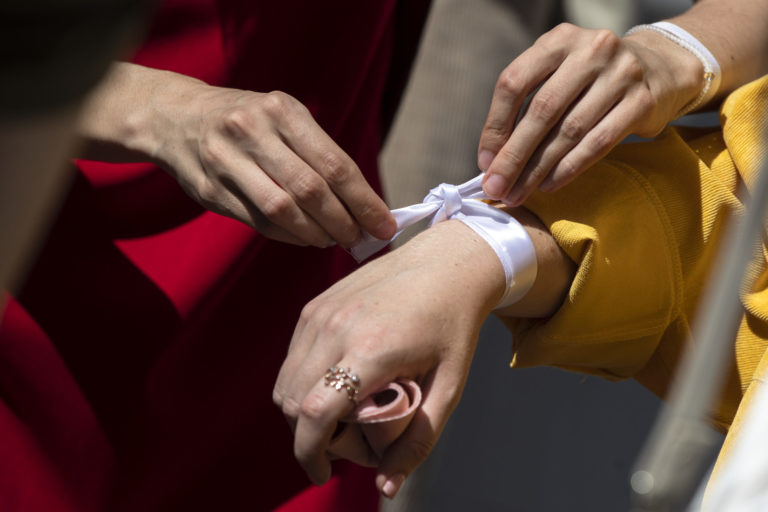 Žena má na ruke uviazanú bielu stužku na znak opozičného hnutia. Foto: SITA/AP