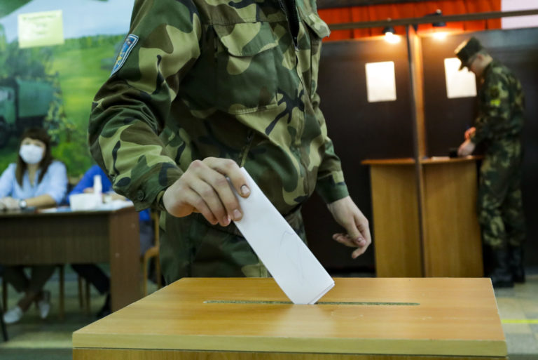 Dať svoj hlas vo voľbách sa rozhodli aj bieloruskí vojaci. Foto: SITA/AP