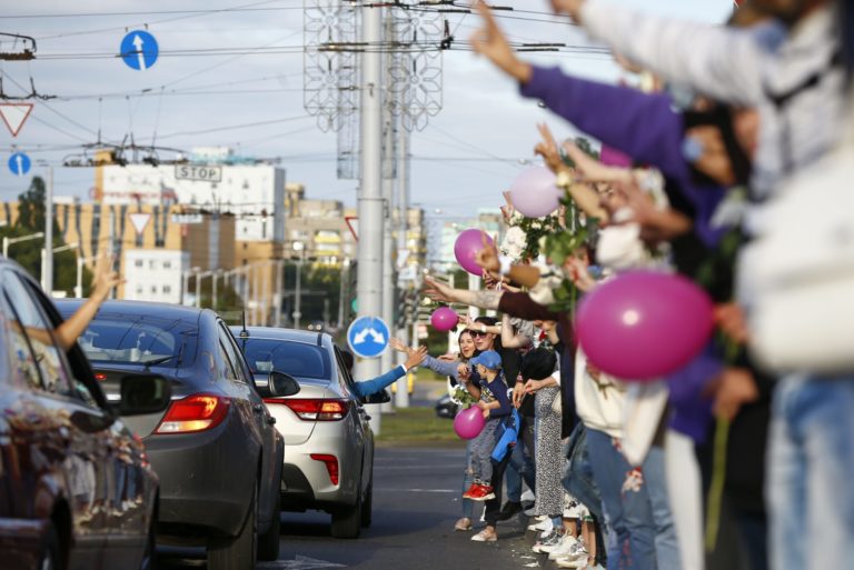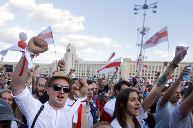 V uliciach Bieloruska sa stále zhromažďujú tisícky ľudí, ktorí nesúhlasia s výsledkom prezidentských volieb. Foto: SITA/AP