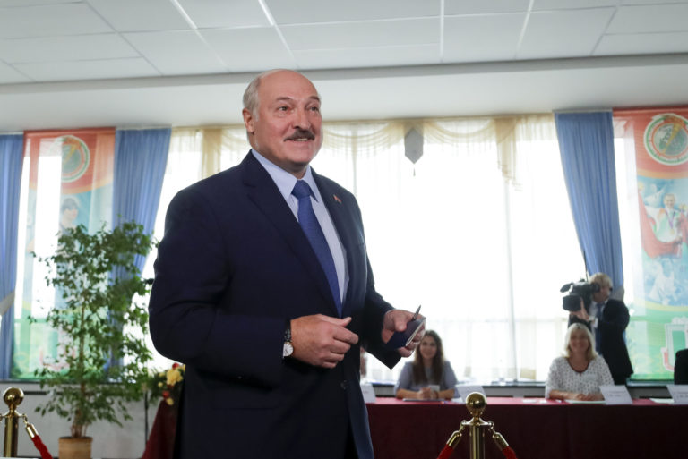 Bieloruský prezident Alexander Lukašenko krátko po vhodení hlasovacieho lístka do urny. Foto: SITA/AP