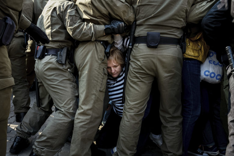 Staršia žena sa háda s policajtami počas demonštrácie v Minsku. 12. október 2020. Foto: SITA/AP