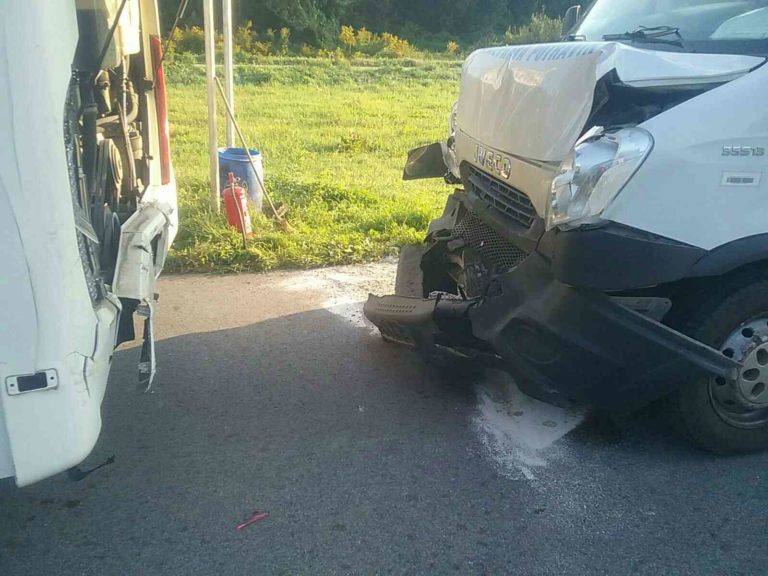 Dodávka narazila do zadnej časti autobusu, v ktorom sa v tom čase viezlo 30 detí do školy. Tie, našťastie, neutrpeli žiadne zranenia. Zranil sa iba vodiča dodávky. Foto: SITA/KR PZ Banská Bystrica.
