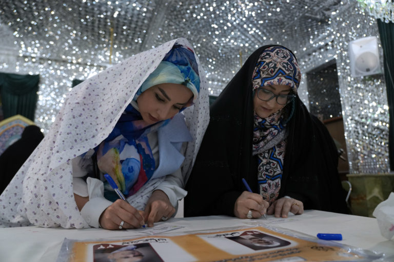Ženy vypĺňajú hlasovacie lístky v prezidentských voľbách vo volebnej miestnosti vo svätyni svätého Saleha v severnom Teheráne v Iráne v piatok 5. júla 2024. Foto: SITA/AP