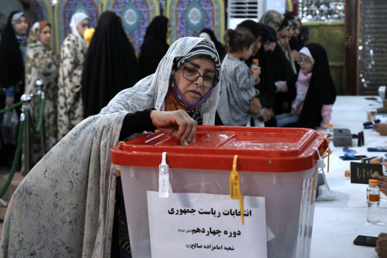 Žena odovzdáva svoj hlas v prezidentských voľbách vo volebnej miestnosti vo svätyni svätého Saleha v severnom Teheráne v Iráne v piatok 5. júla 2024. Foto: SITA/AP
