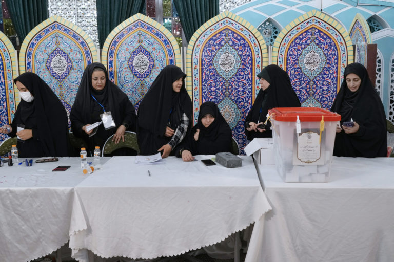 Volební úradníci pracujú počas prezidentských volieb vo volebnej miestnosti v Teheráne v Iráne v sobotu 6. júla 2024. Foto: SITA/AP