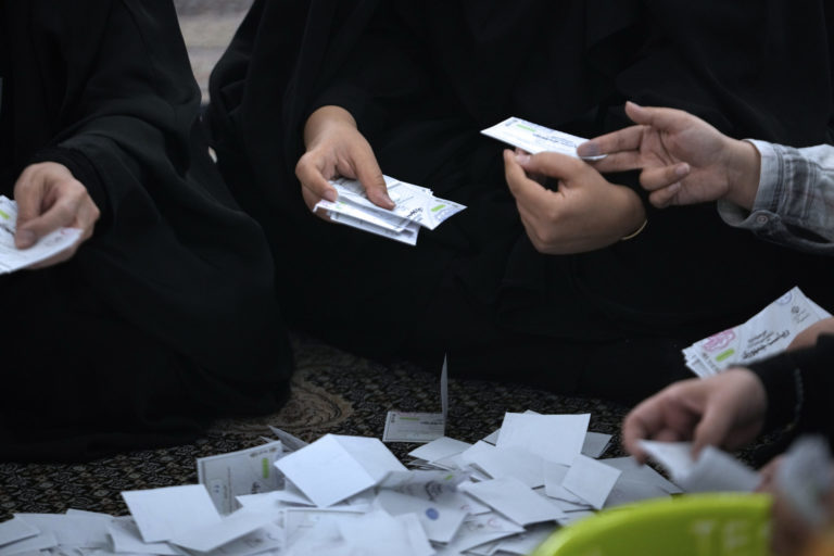 Volební úradníci sčítavajú hlasovacie lístky pre prezidentské voľby vo volebnej miestnosti v Teheráne v Iráne v sobotu 6. júla 2024. Foto: SITA/AP