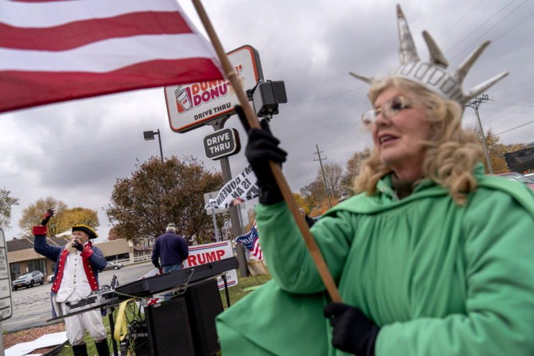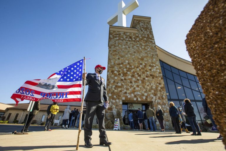 Covey Wise III z Murraysville, podporovateľ prezidenta Donalda Trumpa, stojí pred volebnou miestnosťou na Cornerstone Ministries počas prezidentských volieb v USA. 3. november 2020 Foto: Andrew Rush/Pittsburgh Post-Gazette via AP