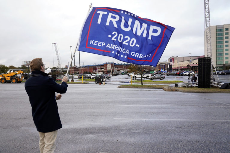 Priaznivec prezidenta Trumpa drží transparent na jeho podporu počas prezidentských volieb 2020 v USA. 3. november 2020 Foto: SITA/AP