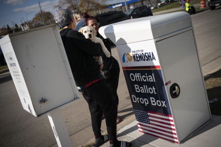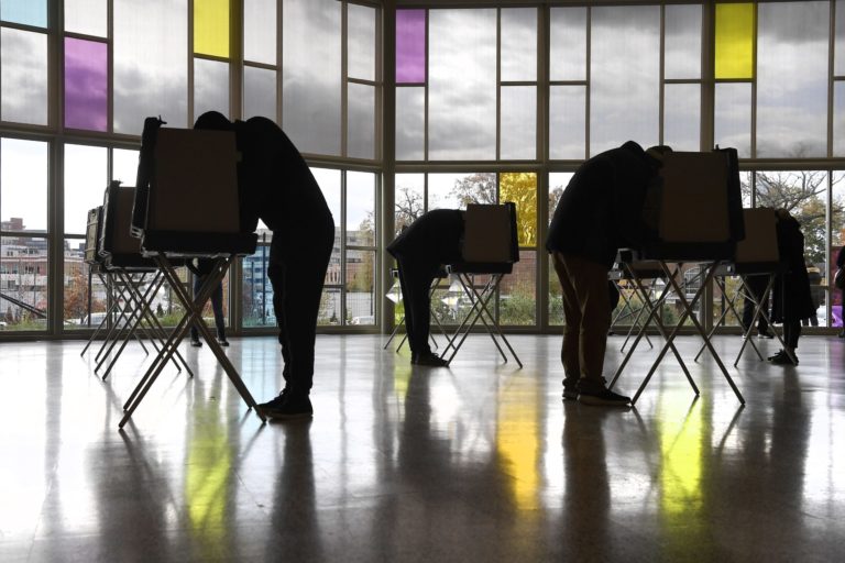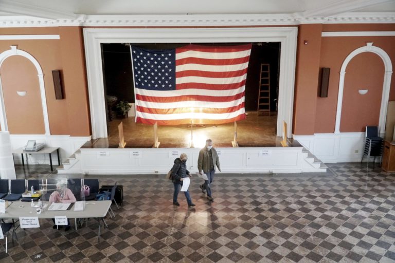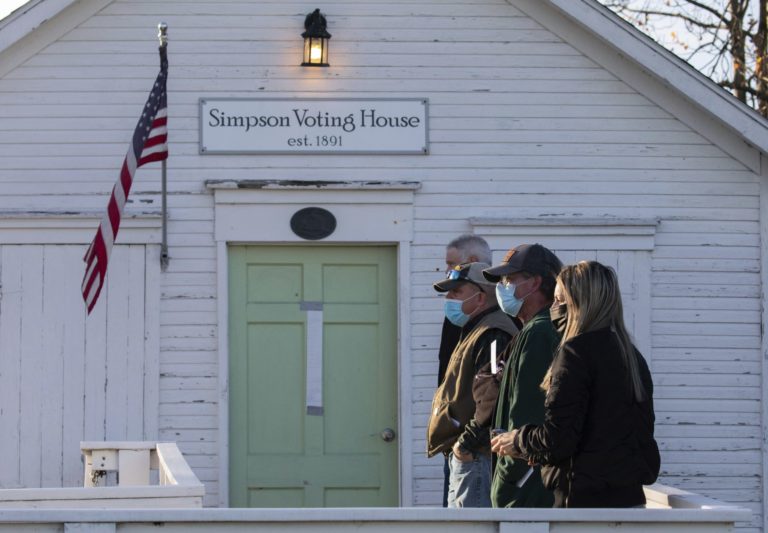 Voliči odovzdávajú svoje hlasovanie lístky v meste Lenox, Massachusetts. 3. november 2020 Foto: Ben Garver/The Berkshire Eagle via AP