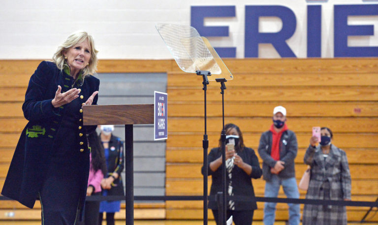 Bývalá druhá dáma Jill Bidenová, žena Joea Bidena - kandidáta na nového amerického prezidenta, čelí otázkam verejnosti. USA, 2 . novembra 2020.