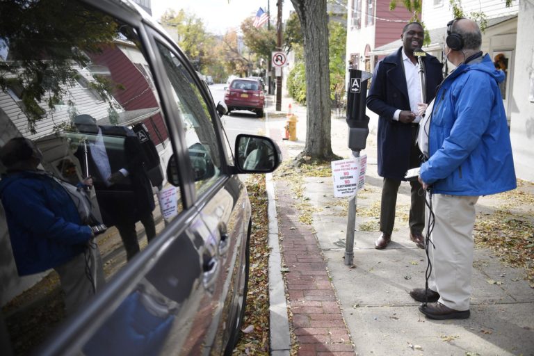 Demokratický kandidát Mondaire Jones stojí za značkou 100 stôp počas prezidentských volieb v USA, keď poskytoval rozhovor do rádia. Dobbs Ferry, New Jersey. 3. november 2020 Foto:AP Photo/Jessica Hill