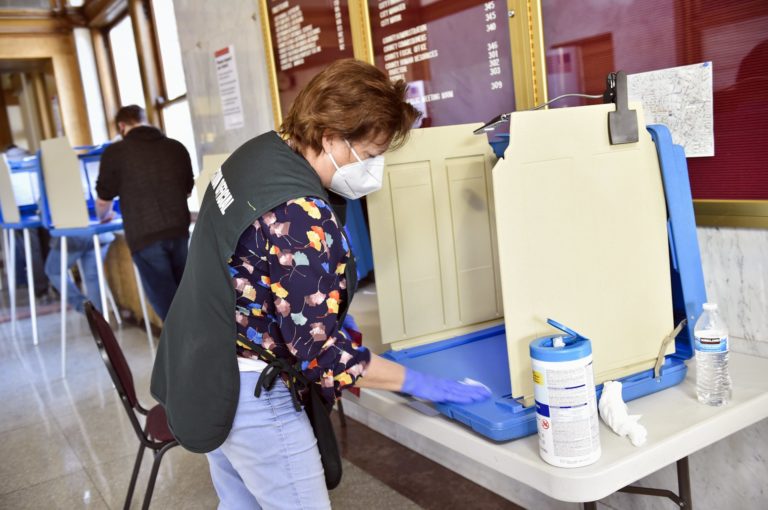Pracovníčka na volebnom okrsku v Lewis and Clark County dezinfikuje volebné miesto počas prezidentských volieb v USA. Helena, Montana. 3. november 2020 Foto: Thom Bridge/Independent Record via AP