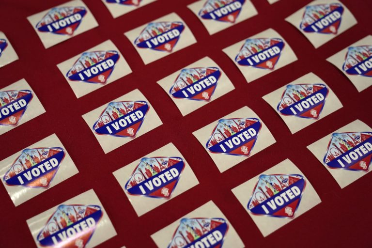 Nálepky "Volil som" na volebnom okrsku v Las Vegas počas dňa prezidentských volieb v USA. 3. november, 2020 Foto: AP Photo/John Locher