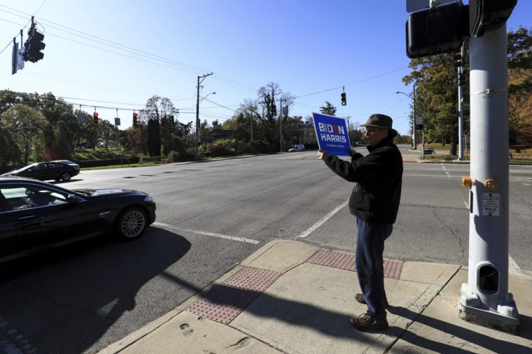 Richard Ganulin drží transparent, ktorým chce podporiť demokratického kandidáta Joea Bidena na amerického prezidenta a zároveň vyzvať, aby prišli Američania k urnám. Cincinnati, 3. november 2020 Foto: AP Photo/Aaron Doster