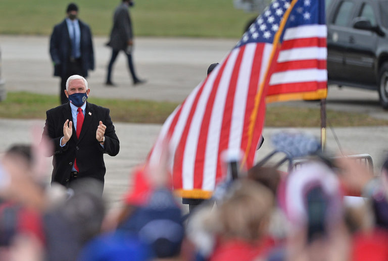 Viceprezident Mike Pence víta dav stoviek ľudí pred začatím poslednej predvolebnej rally. USA, Millcreek TownshiP, 2. novembra 2020. Foto: SITA/AP
