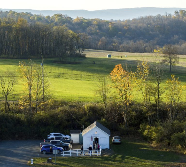 Voliči čakajú v rade pred volebnou miestnosťou Simpsonovho volebného domu. Prvýkrát sa lokalita použila na hlasovanie v roku 1891. Derry Township, Pennsylvania, 3. november 2020 Foto: Andrew Rush/Pittsburgh Post-Gazette via AP