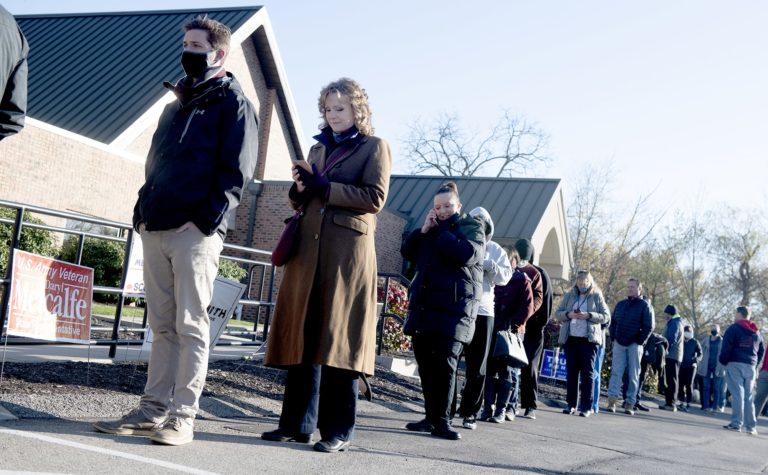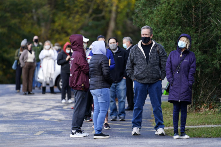 Ľudia čakajú pred volebným okrskom v Hope Lutheran Church, aby mohli hlasovať v prezidentských voľbách v USA. 3. november, Foto: Pam Panchak/Pittsburgh Post-Gazette via AP