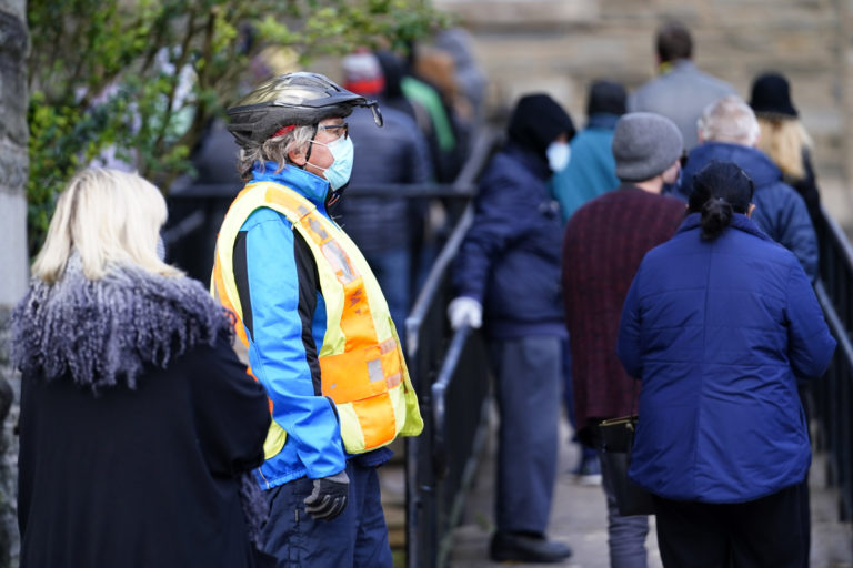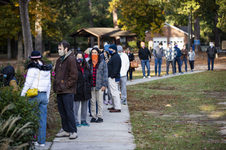 Ľudia čakajú vonku pred volebnou miestnosťou, kým sa dostanú na rad. V Spojených štátoch amerických sa v utorok 3. novembra konajú prezidentské voľby. Verejnosť má na výber medzi aktuálnym prezidentom Donaldom Trumpom a bývalým viceprezidentom Joeom Bidenom. USA, 3. novembra 2020 Foto: SITA/AP