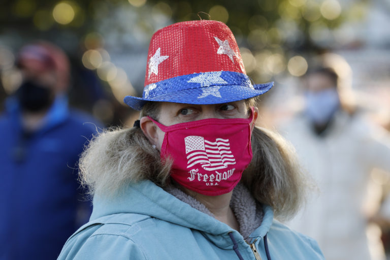 Námorný veterán čaká vonku pred volebnou miestnosťou, kým sa dostane na rad. V Spojených štátoch amerických sa v utorok 3. novembra konajú prezidentské voľby. Verejnosť má na výber medzi aktuálnym prezidentom Donaldom Trumpom a bývalým viceprezidentom Joeom Bidenom. USA, 3. novembra 2020 Foto: SITA/AP