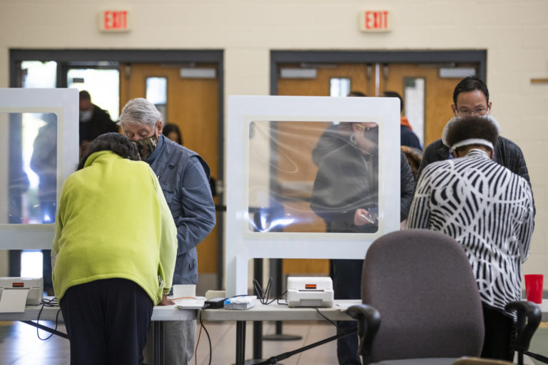 Voliči označia svoje volebné lístky v prvom presbyteriánskom kostole v deň prezidentských volieb v USA. 3. november 2020 Foto: AP Photo/Jessica Hill