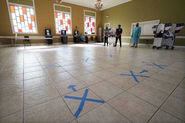 Pracovníci na volebnom okrsku v Katedrále chvály dbajú počas prezidentských volieb v USA na rozostupy pomocou značiek na podlahe.