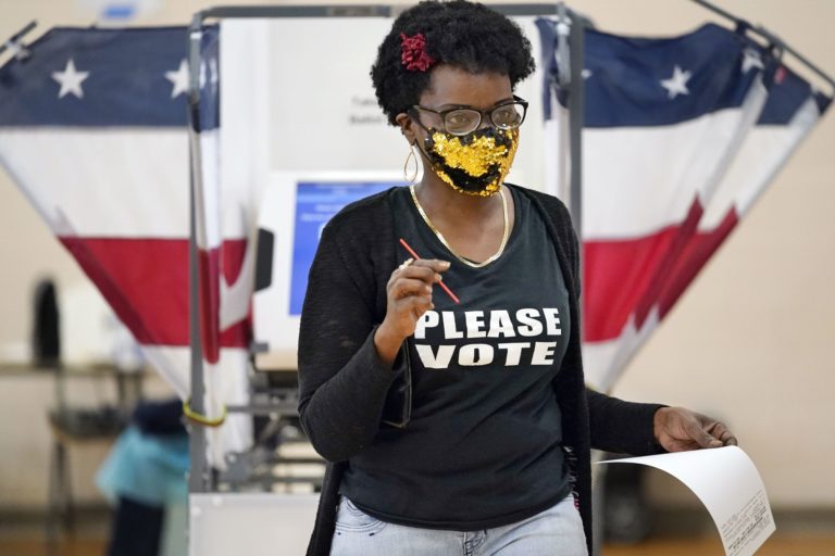 Voliči sa preukazujú ID kartami, aby mohli ísť voliť. V Spojených štátoch amerických sa v utorok 3. novembra konajú prezidentské voľby. Verejnosť má na výber medzi aktuálnym prezidentom Donaldom Trumpom a bývalým viceprezidentom Joeom Bidenom. USA, 3. novembra 2020 Foto: SITA/AP