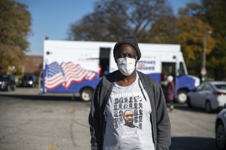 V deň prezidentských volieb stojí žena v tričku so zabitým Georgeom Floydom pred potravinovým nákladným vozidlom Pizza to the Polls a Uber Eats. Cleveland, 3. november 2020 Foto: Matt Schiffler/AP Images for Pizza to the Polls