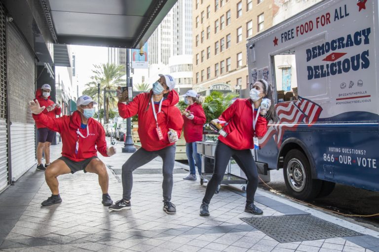 Food truck demokratov stojí v blízkosti volebného okrsku počas prezidentských volieb v USA. Atlanta, 3. november 2020 Ben Rollins/AP Images for Pizza to the Polls