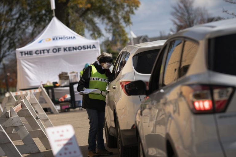 Asistent usmerňuje voličov v drive-in zóne v Kenoshi. Verejnosť má na výber medzi aktuálnym prezidentom Donaldom Trumpom a bývalým viceprezidentom Joeom Bidenom. USA, 3. novembra 2020 Foto: SITA/AP