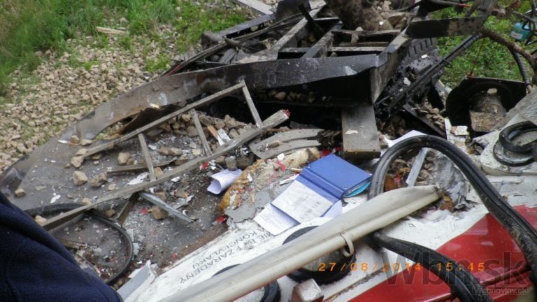 Na nechránenom železničnom priecestí medzi Bánovcami nad Bebravou a obcou Rybany sa zrazil osobný vlak s nákladným autom. Zdravotníci ošetrovali pätnásť zranených z vlaku, z toho päť osôb utrpelo ťažké zranenia. Medzi ťažko zranenými je aj rušňovodič. Bratislava, 28. august 2014. Foto: SITA/Prezídium HaZZ