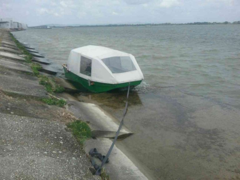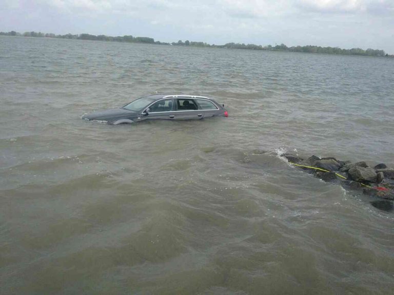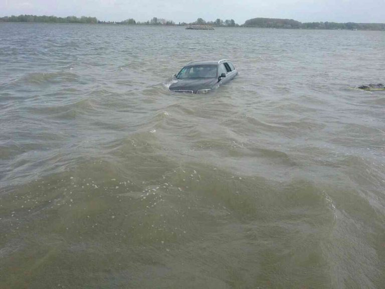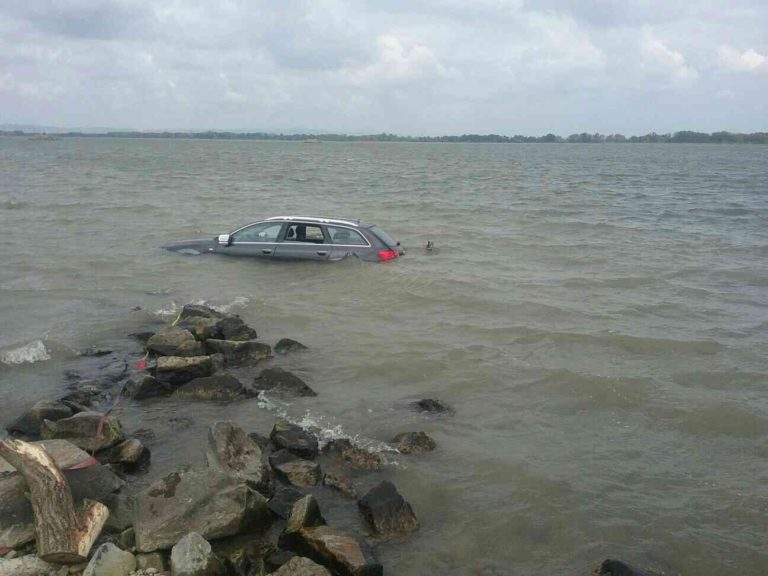 Auto padlo do vody v bratislavskom Čunove pri Danubiane. Pri príchode hasičov bolo auto približne päť metrov od brehu. Vo vode bol aj čln, ktorý sa šofér vozidla snažil dostať na hladinu. Človek, ktorý bol v čase nehody v aute, sa z vozidla dostal sám ešte pred príchodom hasičom. Skupine hasičov sa už podarilo ponorené vozidlo upevniť na oceľové lano, ktorým auto vytiahnu na breh. Bratislava, 8. apríl 2017. Foto: SITA/Prezídium HaZZ