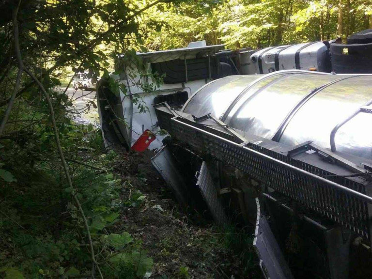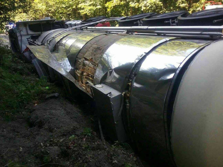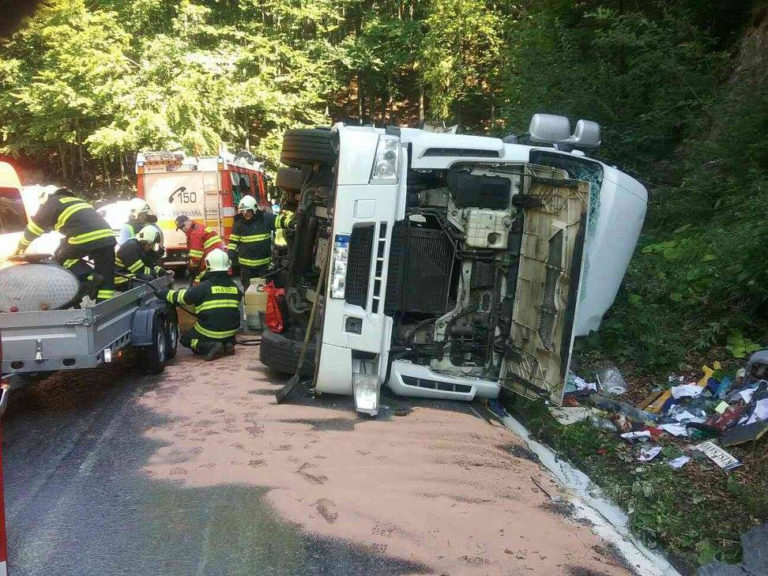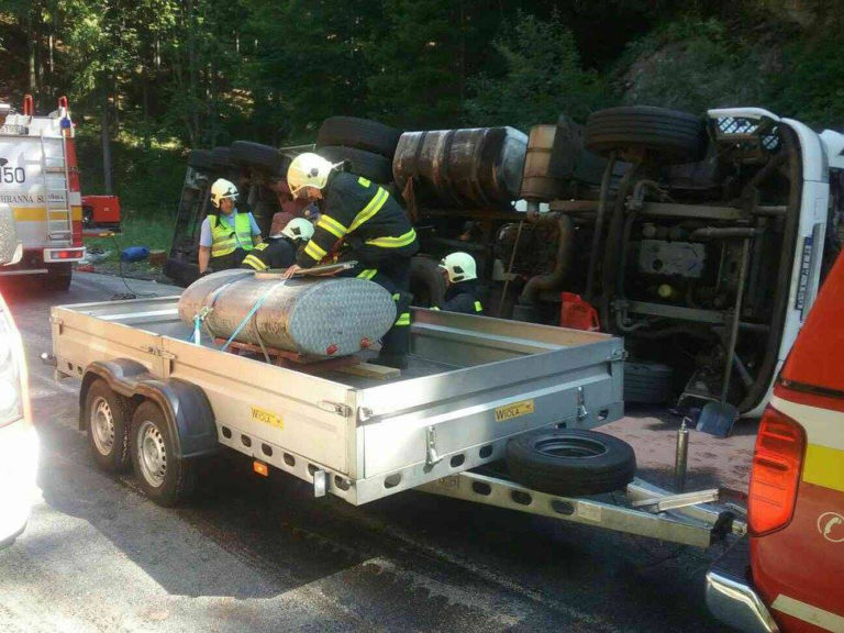 Hasiči zasahovali pri nehode, ktorá sa stala v katastri obce Šturec v okrese Turčianske Teplice. Cesta je uzavretá v oboch smeroch. Prevrátila sa tu cisterna. Zakliesneného vodiča museli z kabíny vyslobodiť pomocou hydraulického zariadenia. 30. augusta 2017 Foto: SITA/HaZZ