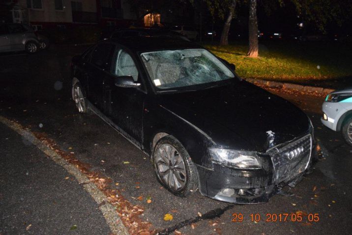 Dopravná nehoda v Prievidzi na Dlhej ulici, pri ktorej bol 42-ročný vinník nehody opitý. Nafúkal takmer tri promile alkoholu. Miroslav prednou časťou svojho vozidla narazil do zadnej časti zaparkovaného vozidla. Po dopravnej nehode vodič nezastavil a pokračoval v jazde. Cestnej premávke nevenoval pozornosť a narazil do fasády stánku. Dopravní policajti vodičovi zadržali vodičský preukaz. Bratislava, 31. október 2017. Foto: SITA/KR PZ Trenčín