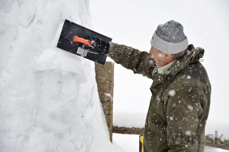 Bývalý chatár a autor kraslice Peter Petras a veľkonočná kraslica zo snehu pri Rainerovej útulni vo Vysokých Tatrách. Vysoké Tatry, 3. apríl 2015. Foto: SITA/Radoslav Maťaš