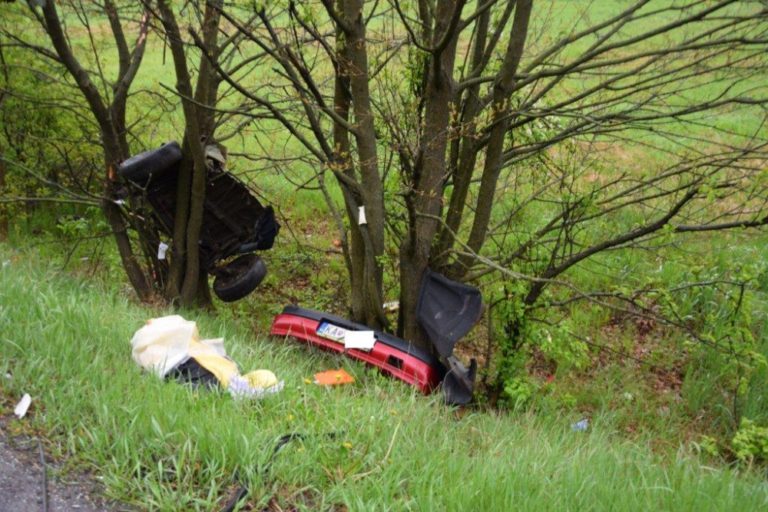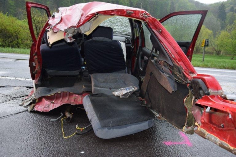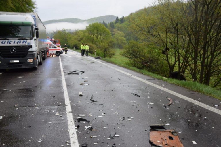 Dnešná dopravná nehoda osobného auta s kamiónom medzi Krupinou a Zvolenom, pri ktorej zahynul 19-ročný mladík a traja ľudia utrpeli zranenia. Bratislava, 27. apríl 2016. Foto: SITA/KR PZ Banská Bystrica