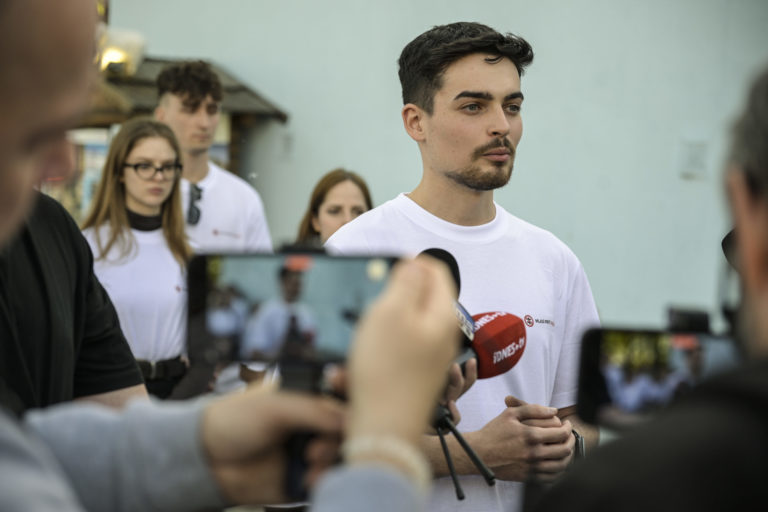 Marek Mach z iniciatívy Mladí proti fašizmu (vľavo) počas tlačovej besedy pred bratislavskou Hlavnou železničnou stanicou po príchode volebného vlaku pred 2. kolom prezidentských volieb 2024, ktoré zorganizovalo občianske združenie Mladí proti fašizmu. Bratislava, 5. apríl 2024. Foto: SITA/Milan Illík