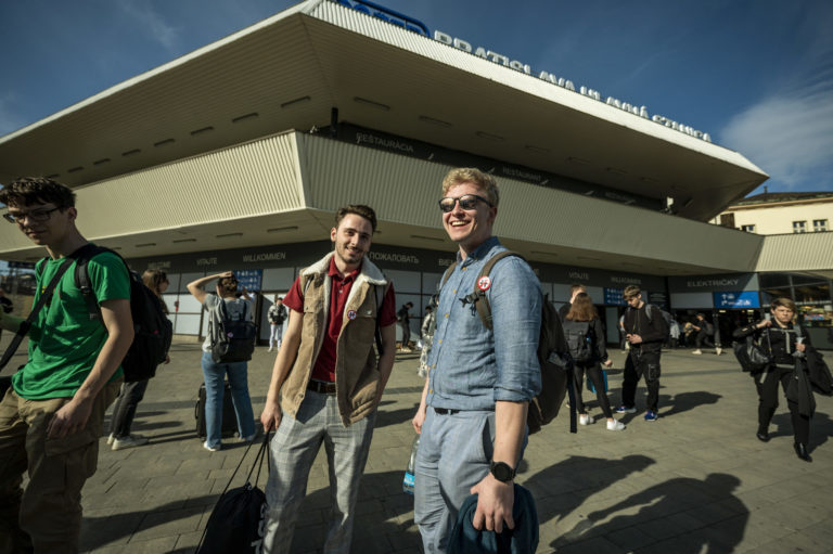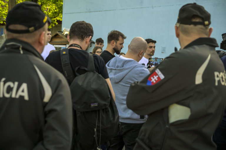 Marek Mach z iniciatívy Mladí proti fašizmu (uprostred) počas tlačovej besedy pred bratislavskou Hlavnou železničnou stanicou po príchode volebného vlaku pred 2. kolom prezidentských volieb 2024, ktoré zorganizovalo občianske združenie Mladí proti fašizmu. Bratislava, 5. apríl 2024. Foto: SITA/Milan Illík