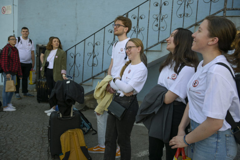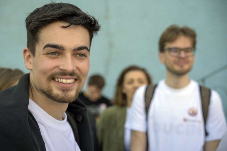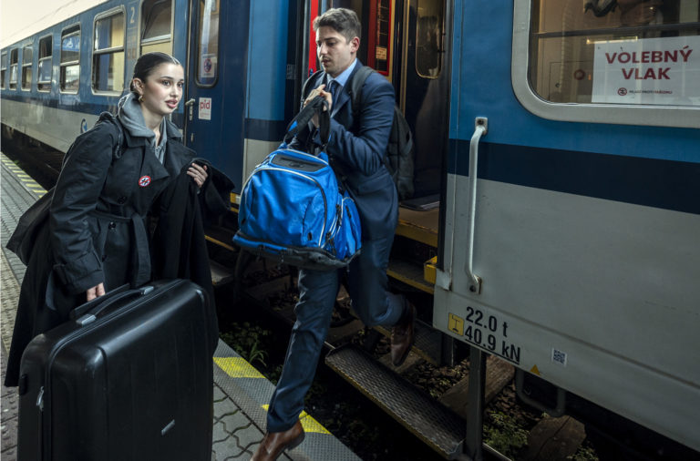 Študenti po príchode volebného vlaku na bratislavskú Hlavnú stranicu, ktoré zorganizovalo občianske združenie Mladí proti fašizmu pred 2. kolom prezidentských volieb 2024, . Bratislava, 5. apríl 2024. Foto: SITA/Milan Illík