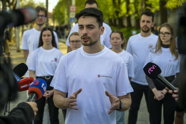 Marek Mach z iniciatívy Mladí proti fašizmu (druhý sprava) počas tlačovej besedy pred bratislavskou Hlavnou železničnou stanicou po príchode volebného vlaku pred 2. kolom prezidentských volieb 2024, ktoré zorganizovalo občianske združenie Mladí proti fašizmu. Bratislava, 5. apríl 2024. Foto: SITA/Milan Illík