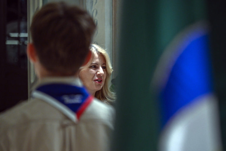 Prezidentka Zuzana Čaputová (vľavo) počas prijatia skautov a Betlehemského svetla v Prezidentskom paláci. Bratislava, 11. december 2023. Foto: SITA/Milan Illík