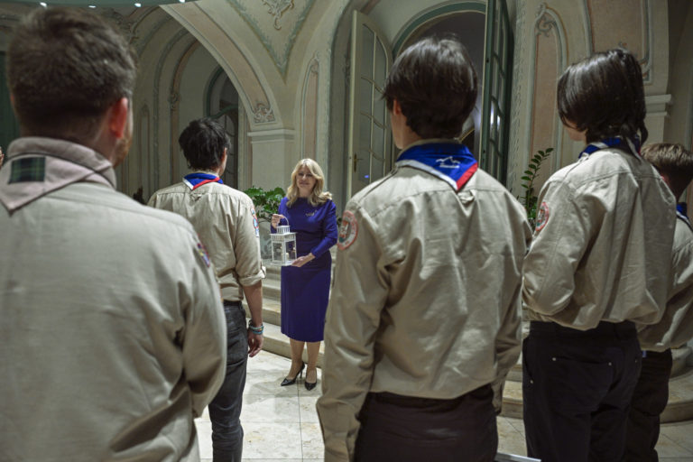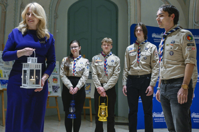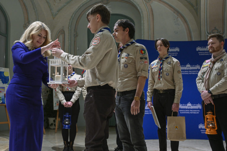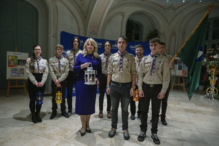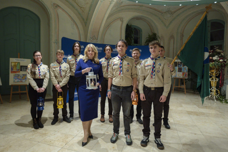 Prezidentka Zuzana Čaputová (uprostred) počas prijatia skautov a Betlehemského svetla v Prezidentskom paláci. Bratislava, 11. december 2023. Foto: SITA/Milan Illík
