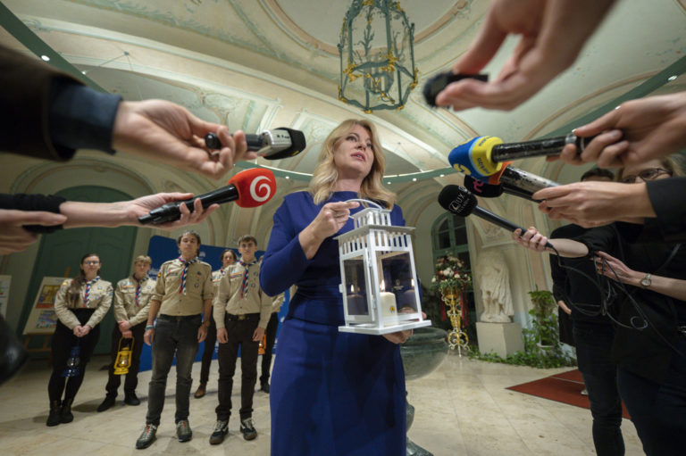 Prezidentka Zuzana Čaputová odpovedá na otázky novinárov počas prijatia skautov a Betlehemského svetla v Prezidentskom paláci. Bratislava, 11. december 2023. Foto: SITA/Milan Illík